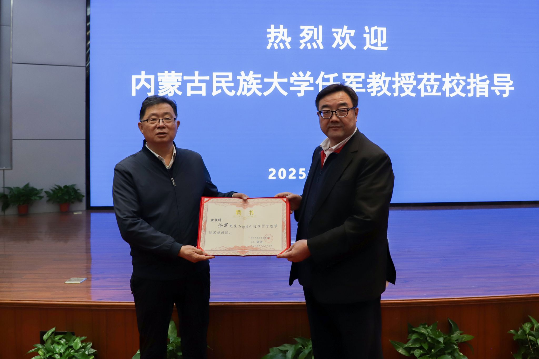 报告结束,董事长王新奇博士为任军教授颁发客座教授聘书。